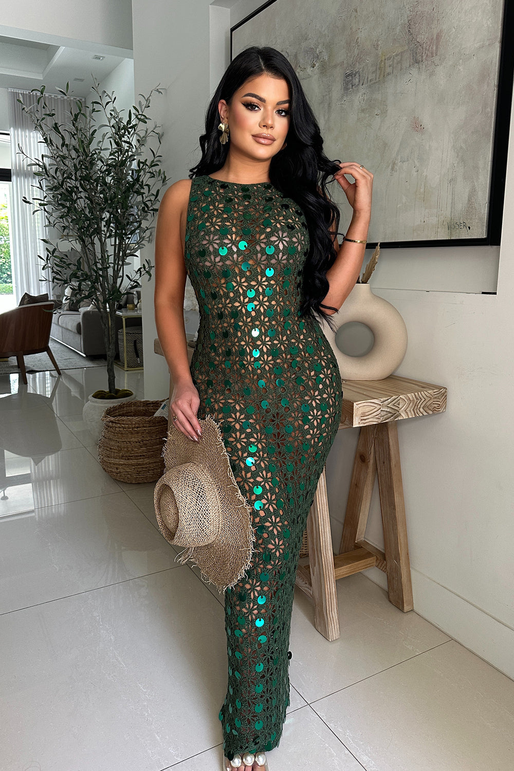 - "Crochet Sequin Hunter Green Maxi Dress"