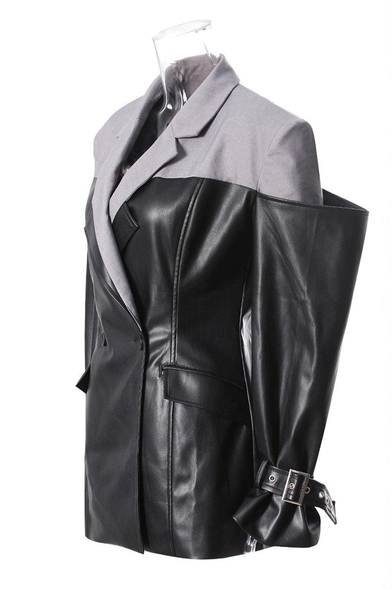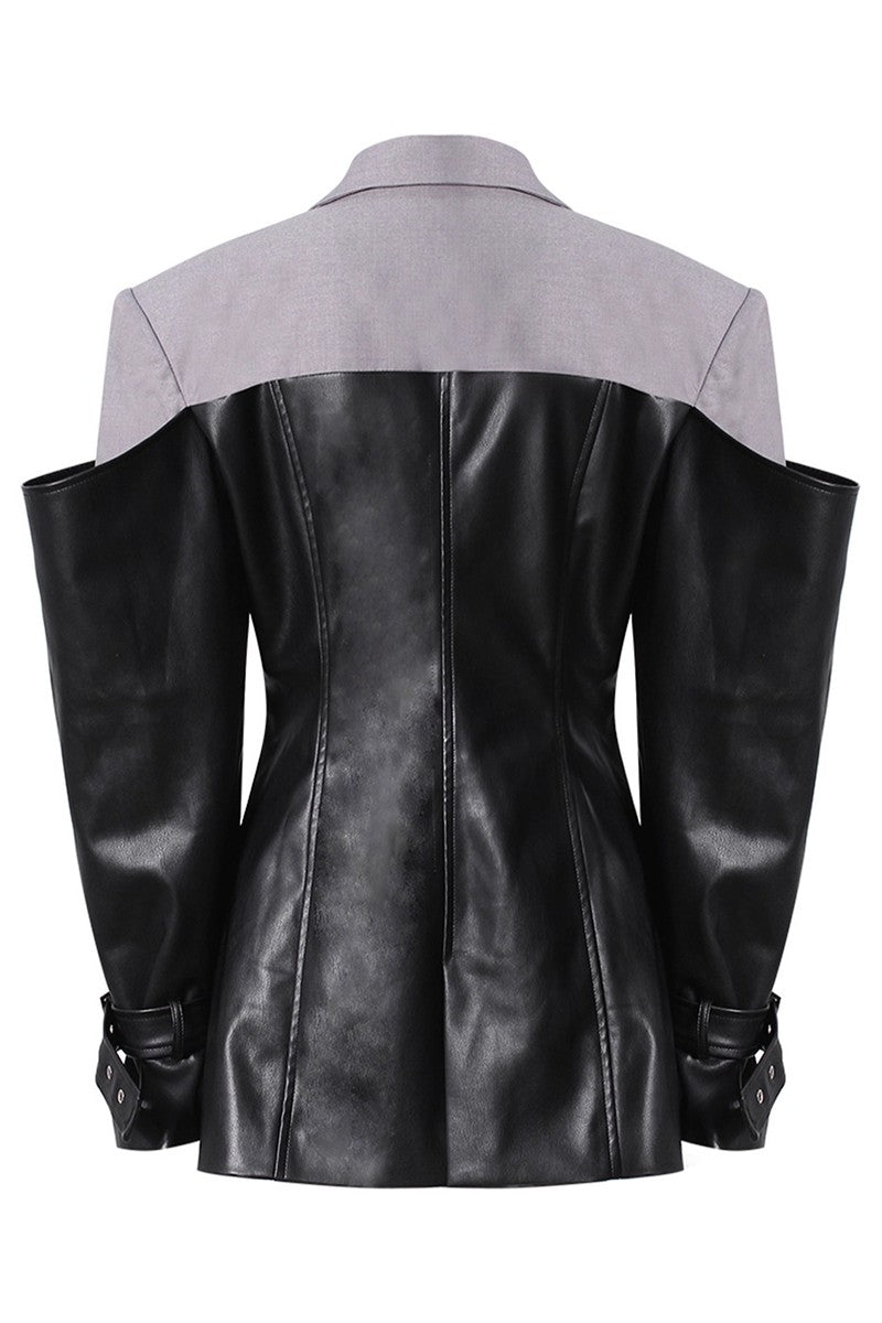 A sharply structured, two-tone statement jacket with sculptural sleeves and a cinched, tailored waist. The top yoke and lapels are cut in a clean light-grey suiting fabric, contrasted against a black faux-leather body. Oversized architectural sleeves create a strong, editorial silhouette, finished with adjustable wrist straps. Double-breasted closure, shaping seams, and a hip-skimming length give it a sharp, fashion-forward fit perfect for nights out and streetwear moments.