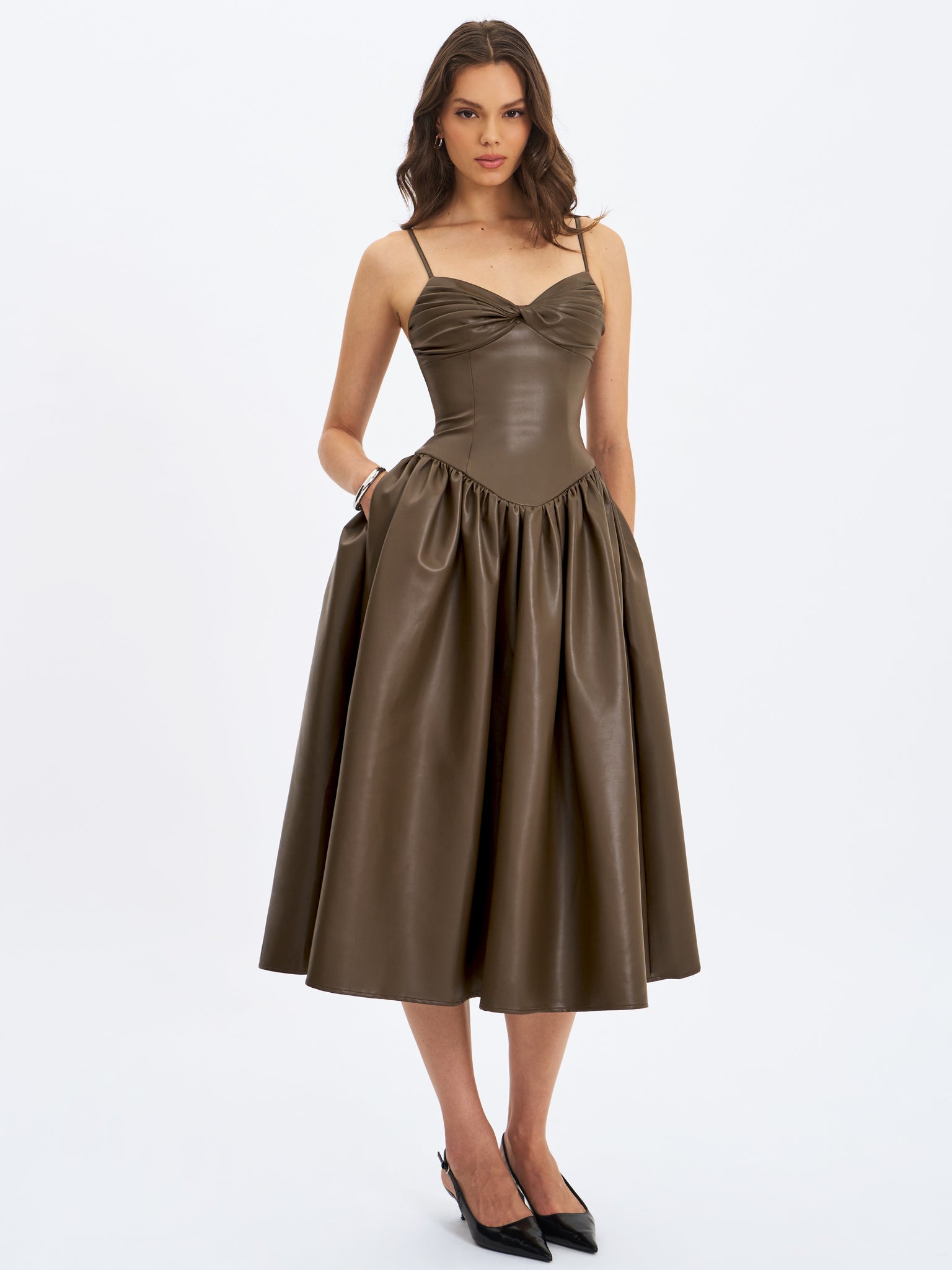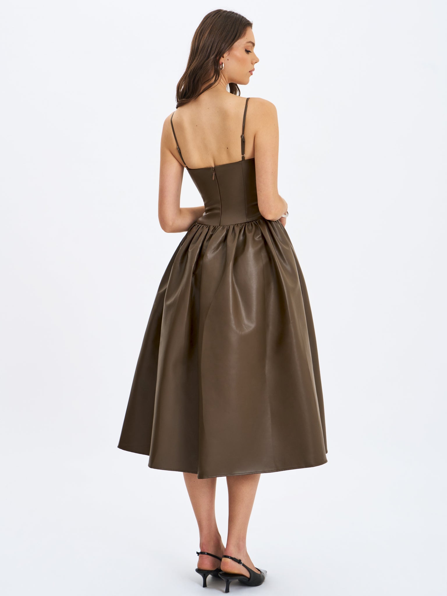 The Parisia Dress brings cocoa vibes to life in buttery-soft vegan leather. With a ruched bust, padded cups, and delicate spaghetti straps, it’s equal parts sultry and sculpted. Princess seams and a cinched waist flow into a drop-waist silhouette, cascading into a gathered A-line maxi skirt for that slow-motion entrance moment. Fully lined in satin and finished with an invisible back zipper, this dress is your go-to for rooftop date nights, gallery soirées, or any evening that deserves a bold statement in a cruelty-free package.