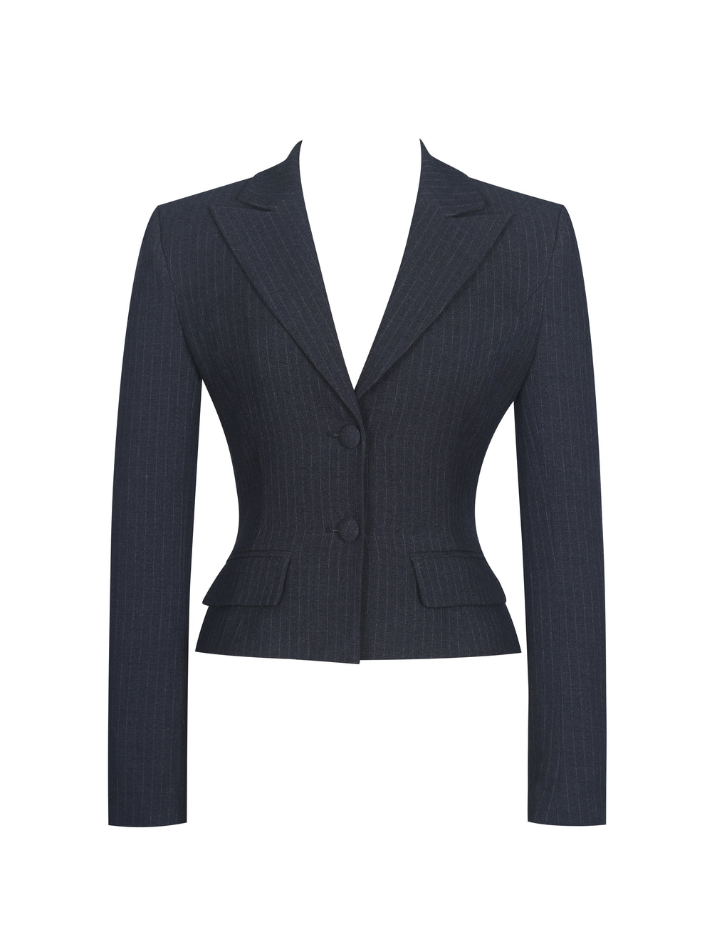 The Quinne Blazer is your go-to for when you want to look like the boss and the muse. This double-button, long-sleeve piece features sharp shoulder pads and a crisp notched lapel that mean business without sacrificing style. A flattering V neckline enhances the décolletage, while subtle princess seams and a tailored fit keep everything structured, sharp, and finished with a gentle flare at the waist for a refined feminine touch. Two decorative flap pockets add polish, while brushed navy crepe with delicate white stripes offers a soft contrast to its power-suit energy. Fully lined in satin, it’s ideal for big meetings, gallery openings, or any occasion that calls for confidence in a tailored package. Perfectly matches with our Quinnie Pant.
