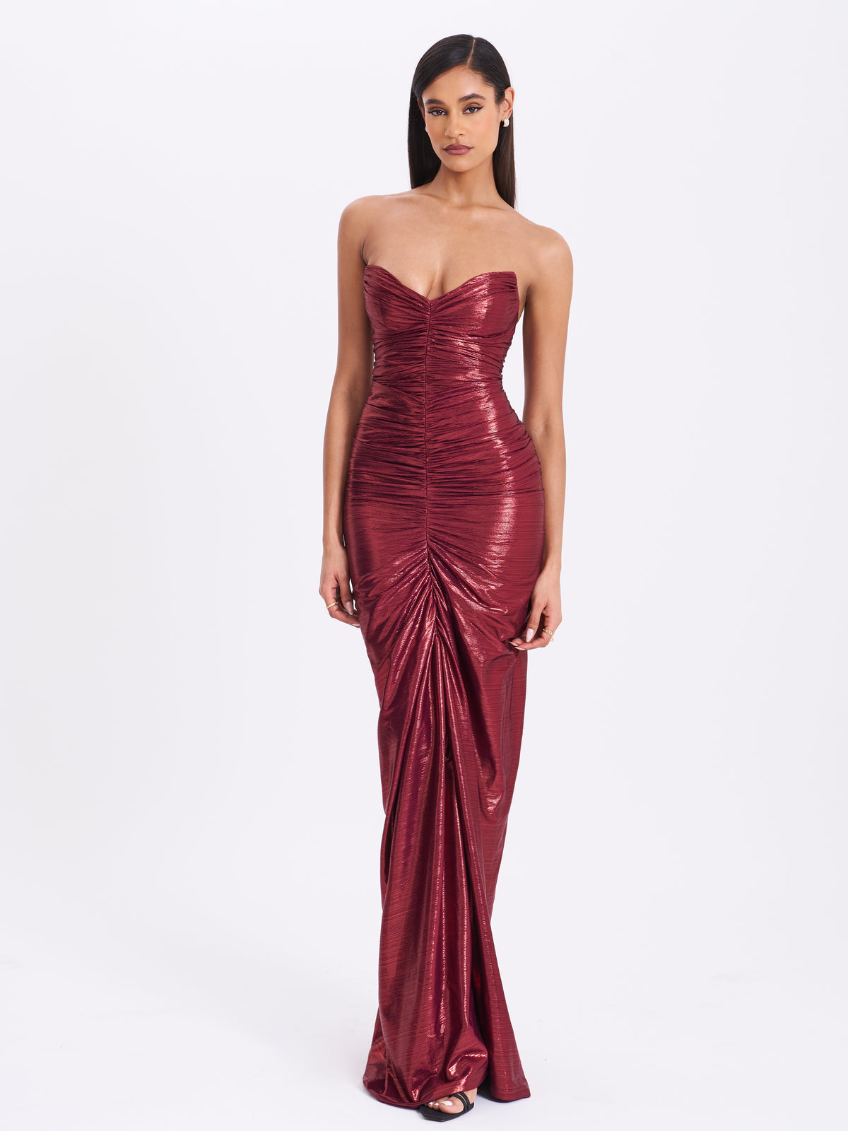 - "Sable Ruched Burgundy Glitter Mermaid Gown"