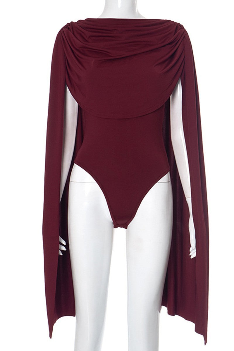 Add some drama to your life with our Cape Sleeve Draped Bodysuit in wine.