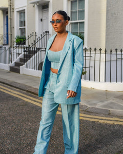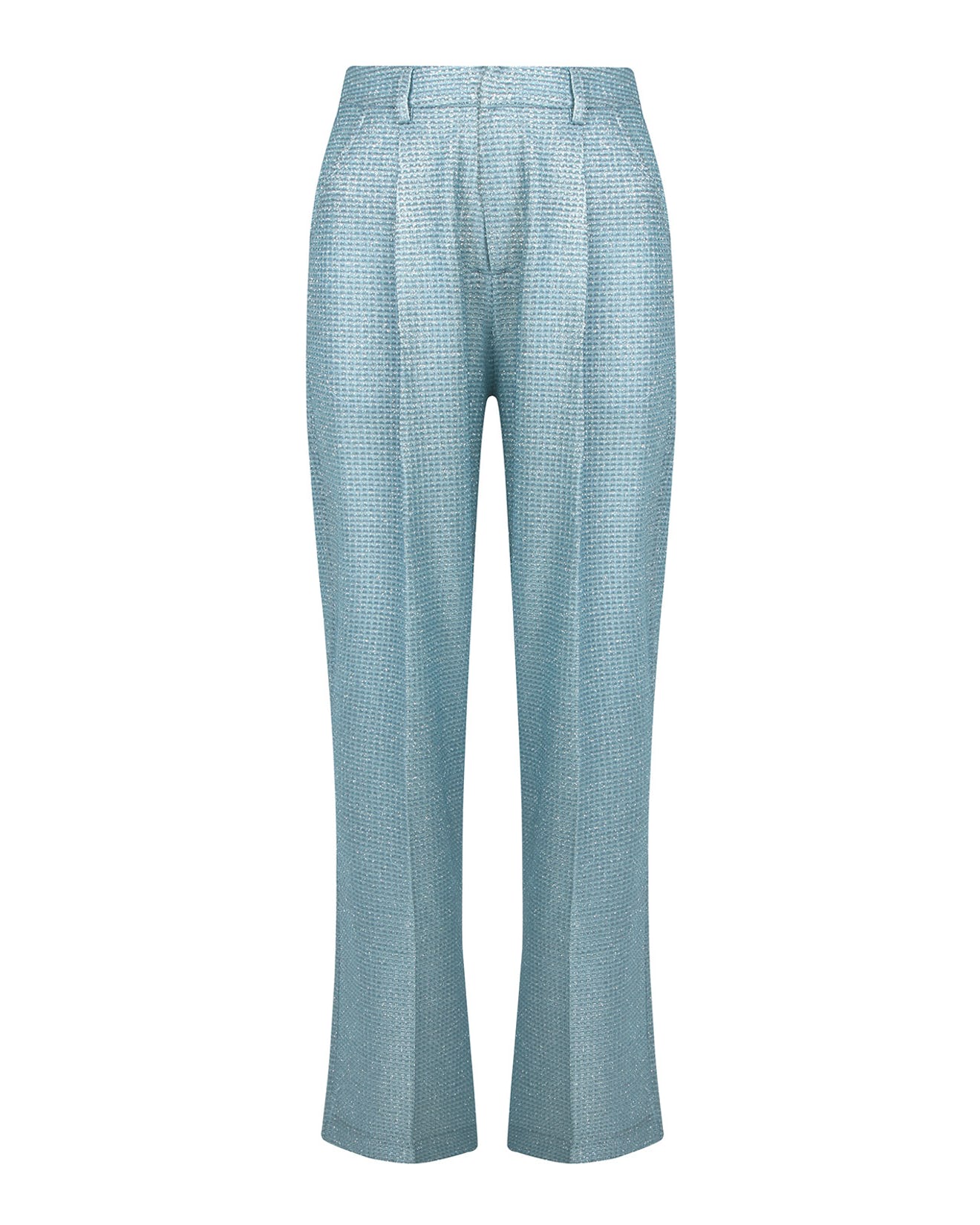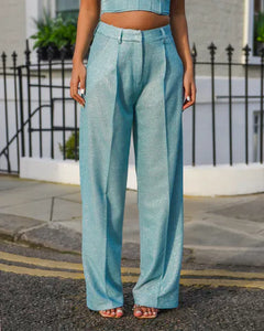 - "Blue Metallic Wide Leg Tailored Trousers"